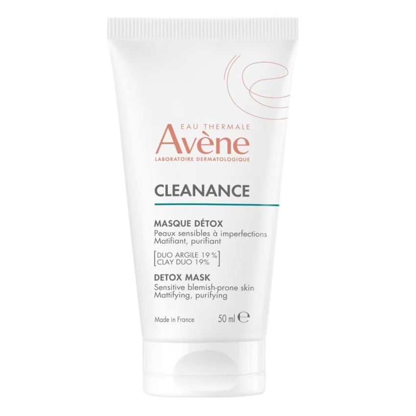 Natychmiast matuje, oczyszcza i zwęża pory, pozostawiając skórę komfortową i ukojoną*.• 5 minut dla zmatowionej, oczyszczonej i komfortowej skóry*• Matuje, oczyszcza, przeciwdziała niedoskonałościom.Idealna dla: kobiet w ciąży, młodzieży i dorosłychTyp skóry: tłusta, z niedoskonałościami, wrażliwaPotrzeby: przeciw niedoskonałościom, zapobiega błyszczeniuCleanance Detox Mask to bezkompromisowa maska dla skóry wrażliwej z niedoskonałościami. Dzięki ekskluzywnemu połączeniu skoncentrowanych glinek chłonnych (19%) i złuszczającego perlitu oczyszcza, matuje i zwęża pory w 5 minut*. Pozostawia skórę komfortową i ukojoną dzięki składnikom nawilżającym i odżywczym związanym z wodą termalną Avene, a wszystko to w biodegradowalnej i wegańskiej formule. Niedoskonałości są zredukowane u 90% użytkowników**.Zaleta: Maska skoncentrowana w glinkach, zapewniająca natychmiastowe rezultaty*. Twoja skóra jest zmatowiona, oczyszczona i komfortowa. Niedoskonałości są zredukowane u 90% użytkowników**.Korzyści:• Matująca: pochłania nadmiar sebum dzięki duetowi glinek• Oczyszczająca: wzbogacona perlitem, który umożliwia delikatne złuszczanie• Łagodząca: dzięki połączeniu wody termalnej Avene i gliceryny*Badanie konsumenckie – 130 osób – 18-65 lat – natychmiastowe rezultaty**Kwestionariusz dopuszczalności, % zgodności, 31 badanych, 2 użycia tygodniowo przez 3 tygodnieSposób użycia: Nakładaj 1 do 2 razy w tygodniu na całą twarz, na czystą i suchą skórę. Pozostaw na 5 minut. Dokładnie spłucz, lekko masując.