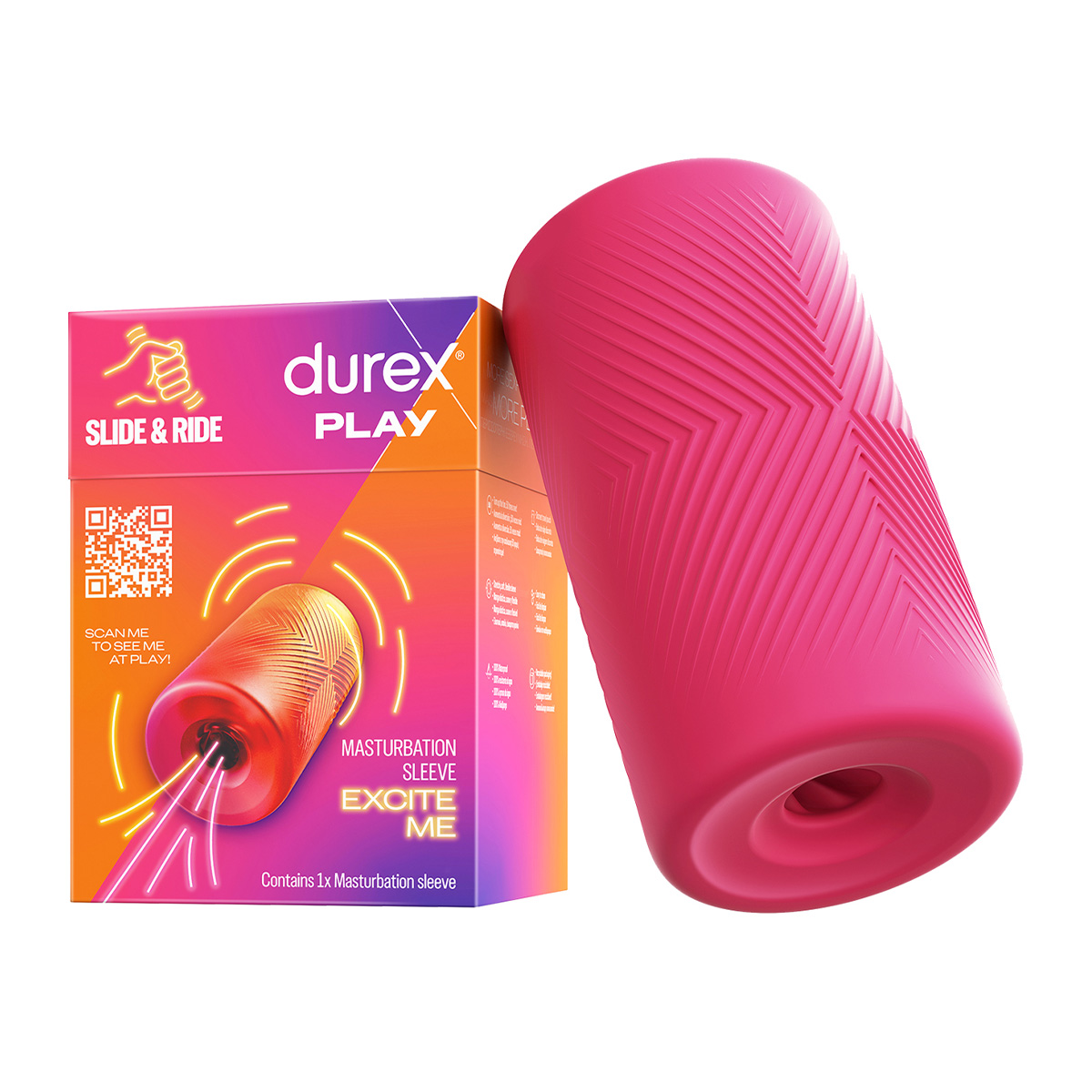 Z rękawem do masturbacji Slide & Ride wybierz swoją ścieżkę do przyjemności, która rozpłynie się po Twoim ciele. Idealny do sesji solo lub w towarzystwie innych. Masturbator zapewnia mnóstwo zabawy w łóżku lub pod prysznicem. Dzięki swojej wszechstronności zmienia on zasady gry. Z pewnością będziesz wracać po więcej.Za co pokochasz rękaw do masturbacji Durex Slide & Ride?• Jest elastyczny i miękki w dotyku. Dzięki temu dopasowuje się do Twojego ciała i zapewnia najbardziej sensualne doznania.• 100% WODOODPORNY: Możesz bawić się gdziekolwiek chcesz – pod prysznicem lub w wannie.• Jest łatwy w czyszczeniu.• Produkt bezftalanowy, bezpieczny do użycia na Twoim ciele.• Odpowiedni do stosowania z lubrykantem na bazie wody.• Opakowanie nadaje się do recyklingu.W opakowaniu znajdziesz oprócz gadżetu dyskretne etui podróżne. Czy ten gadżet erotyczny posiada gwarancję?Nie, jednak możesz zapewnić dłuższy czas działania swojemu urządzeniu dbając o jego czystość zgodnie z instrukcją, używając go wraz z lubrykantem na bazie wody, a także właściwie je przechowując.Jak przechowywać ten gadżet?Przechowuj swój masturbator w etui, a także w suchym, chłodnym, niezakurzonym i wentylowanym miejscu, z dala od promieni słonecznych.