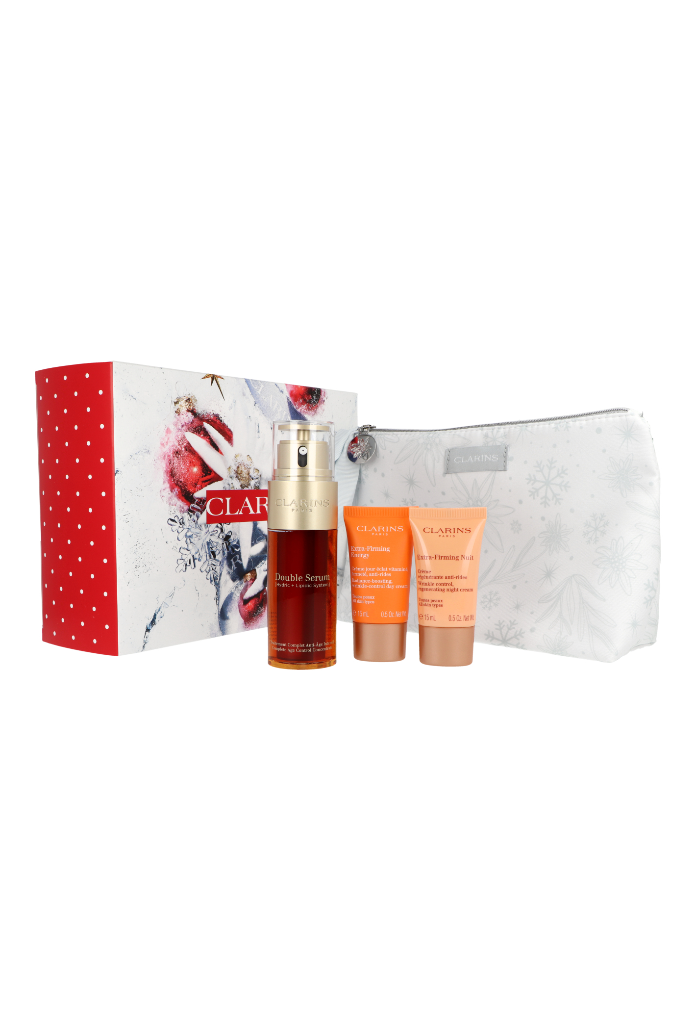 Zestaw Clarins Double Serum 50ml + Extra-Firming Energy Day Cream 15ml + Extra-Firming Night Cream 15ml + Pouch